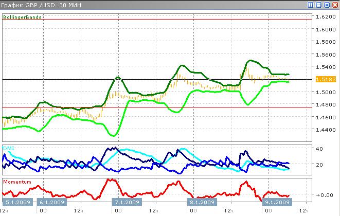 Фунт всю неделю растёт против доллара, и сегодняшний день - не исключение. На данный момент тренд слабый, нисходящий, однако, как мы не раз уже наблюдали, за ним, видимо, последует рост. Внутридневной максимум 1.5253. Сейчас британская валюта клеблется вблизи сегодняшнего уровня поддержки 1.5186. Индикатор средненаправленного движения около 15, на данном этапе показания DI- превышают показания DI+, однако оба индикатора показывают слабые тренды. Скорость изменения цен мала, по индикатору momentum.