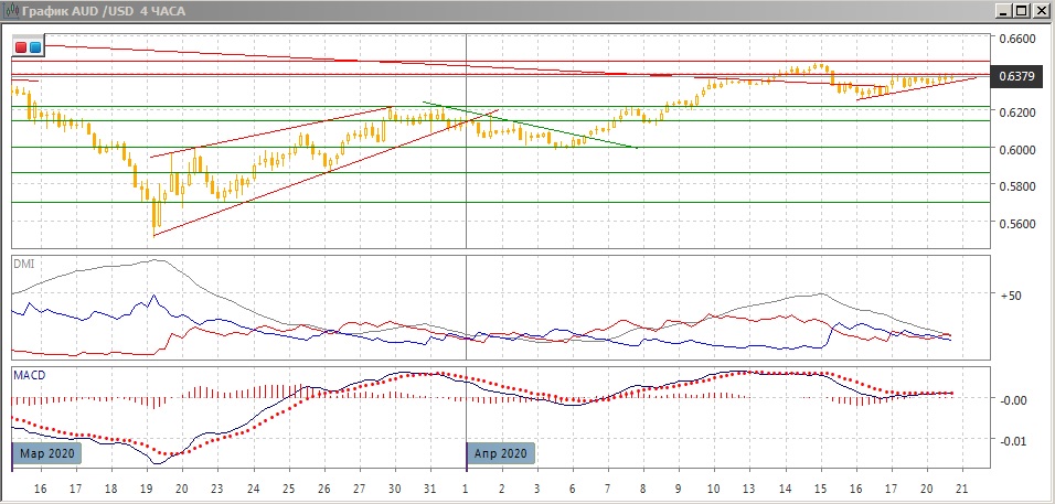 На четырёхчасовом графике пара находится немного ниже 0,6400. Здесь образовалась уже вторая небольшая вершина. Ближайшая перспектива, вероятно, будет зависеть от того, преодолеет ли пара уровень 0,6400 (тогда стоит ожидать продолжения роста), или рост относительных максимумов будет нарушена и тогда стоит ожидать отката к поддержке на 0,6220. По индикаторам направленного движения флэт: DM- и DM+ близки, гистограмма MACD около нуля, линия MACD примерно горизонтальна.