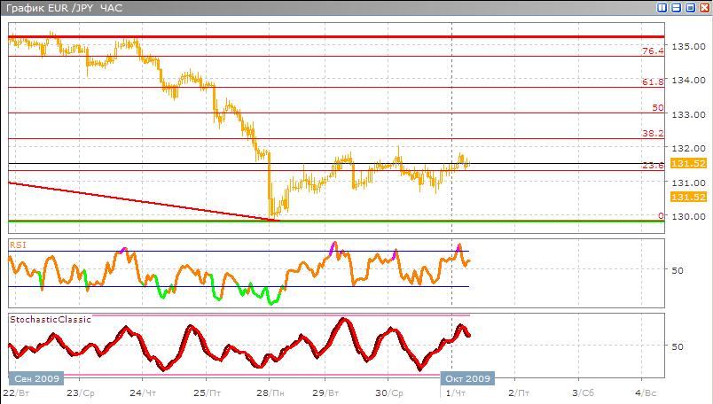 Валютная пара находится в районе 23,6% по Фибоначчи и не совершает каких бы то ни было сильных движений. Валюта также как и британский фунт к йене находится во флете и ждет своего пробоя канала с последующим ускорением. Скорее всего это движение будет вверх. По стандартным индикаторам таким как Stohastic он указывает что валюта пойдет на вверх после своего пересечния, а RSI также развернулся на вверх, хотя данные сигналы не сильные из-за их близкого разворота возле зон перекупленности.