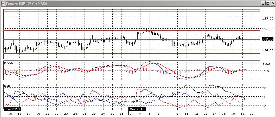 На четырёхчасовом графике пара находится около середины диапазона с начала февраля. Уровень 125,00 выступает сейчас поддержкой, но если колебания будут идти как раньше, то поддержка может быть у 124,35. По индикаторам направленного движения флэт: гистограмма MACD колеблется около нулевого уровня, DM+ и DM- пересекаются. Если смотреть шире, до диапазон длится относительно долго, что увеличивает вероятность выхода из него.