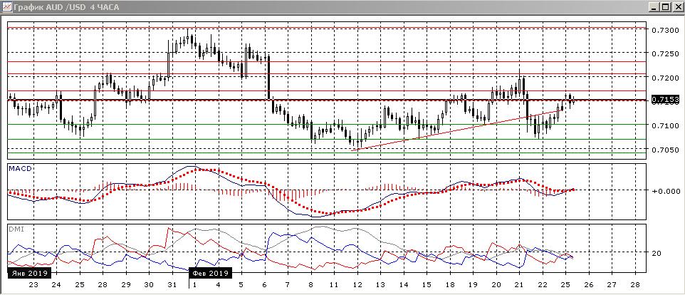 На четырёхчасовом графике ниже 0,7170 снижение приостановилось, и при возвращении ниже 0,7150 может начаться снижение к 0,7100, как в двух случаях ранее во второй половине февраля. По ADX тенденции сейчас нет (DM+ и DM- близки при низком уровне ADX). Предпосылок для прорыва сильного сопротивления на 0,7170 сейчас не видно.