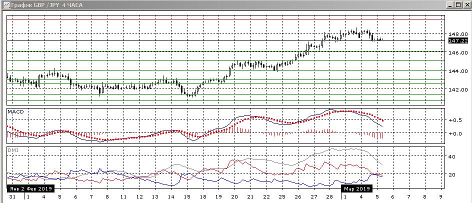 На четырёхчасовом графике пара переходит к снижению: последовательность роста относительных максимумов и минимумов пары нарушена. Сейчас относительные максимумы и минимумы пары снижаются, и может образоваться вершина у 148,50. По индикаторам направленного движения пара тенденция изменилась: гистограмма MACD находится в отрицательной зоне, линия MACD сохраняет отрицательный наклон, при этом превышения DM+ над DM- уже нет.