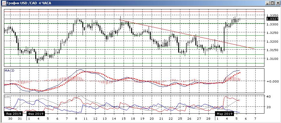 На четырёхчасовом графике тенденция снижения изменилась, после преодоления нисходящей линии тренда с середины февраля. Пара закрепилась выше уровня 1,3300. Закрепление выше ранее тестировавшегося уровня сопротивления делает более вероятным продолжение роста до 1,3370. По индикаторам направленного движения рост стал сильной тенденцией: превышение DM+ над DM- очень большое, ADX на высоком уровне, гистограмма MACD остаётся в положительной зоне, линия MACD имеет положительный наклон. Отсутствие отката после резкого роста скорее также в пользу продолжения роста в краткосрочной перспективе.