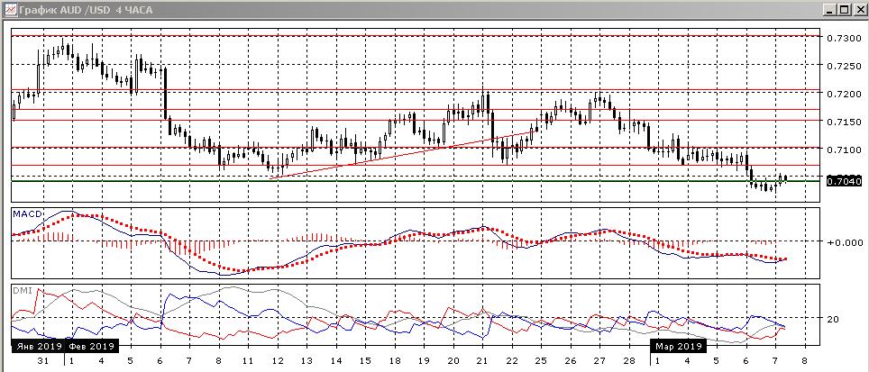 На четырёхчасовом графике последовательное снижение относительных максимумов и минимумов пары продолжается. Образовалось бычье расхождение минимумов пары и гистограммы MACD, что облегчает отскок вверх. Сопротивлением при этом может быть ранее преодолённый уровень 0,7070. Пока пара ниже этого уровня, возобновление снижения кажется предпочтительным с целью на психологически важном уровне 0,70, который близко.