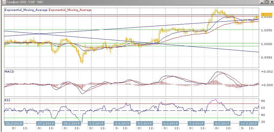 На этой неделе валютная пара продолжает восходящее ралли после показанного минимума от 28 февраля на 0.9926. К концу прошедшей недели котировки USD/CHF уверенно закрепились выше 1.0068, что открывает дорогу далее до следующего уровня сопротивления в районе 1.0150 и выше до 1.0200. Во время Австралийской торговой сессии сегодня пара пытается закрепиться выше отметки 1.0100.