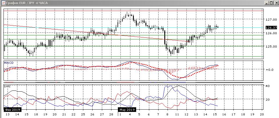 На четырёхчасовом графике хорошо видно что пара закрепилась после преодоления сопротивления на 125,80, однако тенденция роста замедляется — образовалось расхождение максимумов пары и гистограммы MACD, что увеличивает вероятность отката обратно к поддержке на зоне 125,80-126,00. Последовательность роста относительных максимумов и минимумов пары от 124,25 сохраняется. По ADX тенденция роста усилилась: превышение DM+ над DM- увеличилось, уровень ADX также вырос. Краткосрочно кажется, что даже при возможном откате рост предпочтителен.