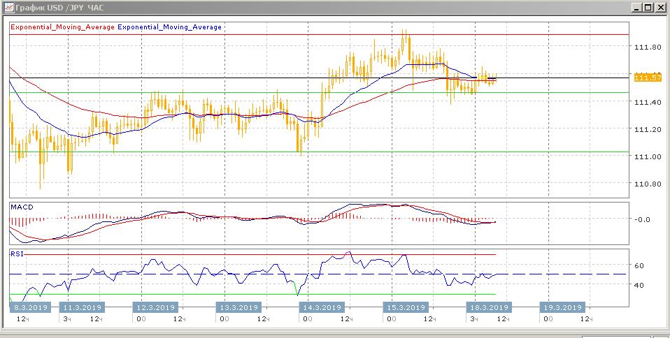 С открытием торгов сегодня медведи чуть продавили рынок до текущего уровня поддержки на 111.45, но пока что все попытки его преодолеть остаются тщетными. Более сильным сопротивлением остаётся отметка 111.05, как это видно на часовом графике.