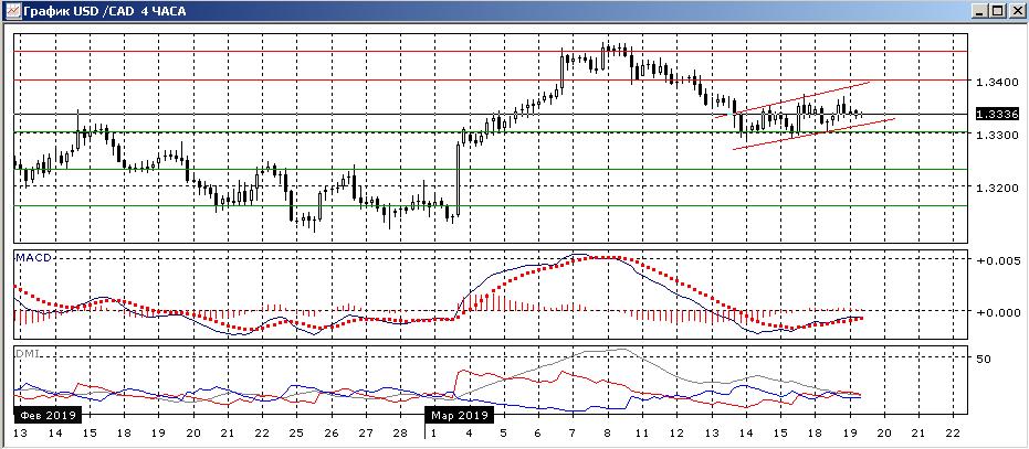На четырёхчасовом графике рост пары в узком восходящем канале от 1,3300 может быть как разворотом, так и фигурой продолжения после значительного снижения с 8 марта. Около 1,3300 образовалось три относительных минимума, что укрепляет уровень поддержки. Последовательность снижения относительных максимумов и минимумов пары также развёрнута: теперь они последовательно растут, и это может говорить в развороте тенденции снижения. По индикаторам направленного движения скорее флэт: DM+ и DM- близки, гистограмма MACD около нуля, линия MACD имеет слабый наклон вверх. Если движение в растущем канале продолжается, ближайшая цель — отскок к 1,3370, далее — к верхней границе канала около «круглого» уровня сопротивления 1,3400.