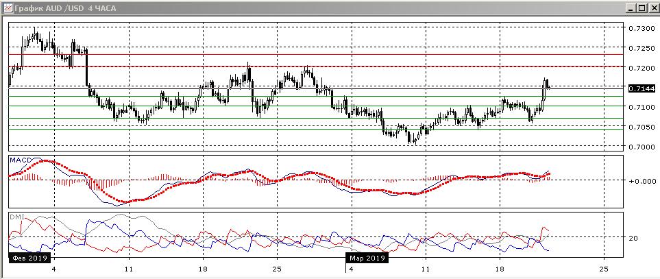 На четырёхчасовом графике пара резко выросла после заседания ФРС и данных по занятости в Австралии. Сильное движение предполагает, что скорее оно будет продолжаться в краткосрочной перспективе (а это приводит к цели на 0,7200). По индикаторам направленного движения в это масштабе тенденция роста уже хорошо выражена: гистограмма MACD растёт в положительной зоне, линия MACD имеет положительный наклон, превышение DM+ над DM- относительно большое, ADX выше 20.