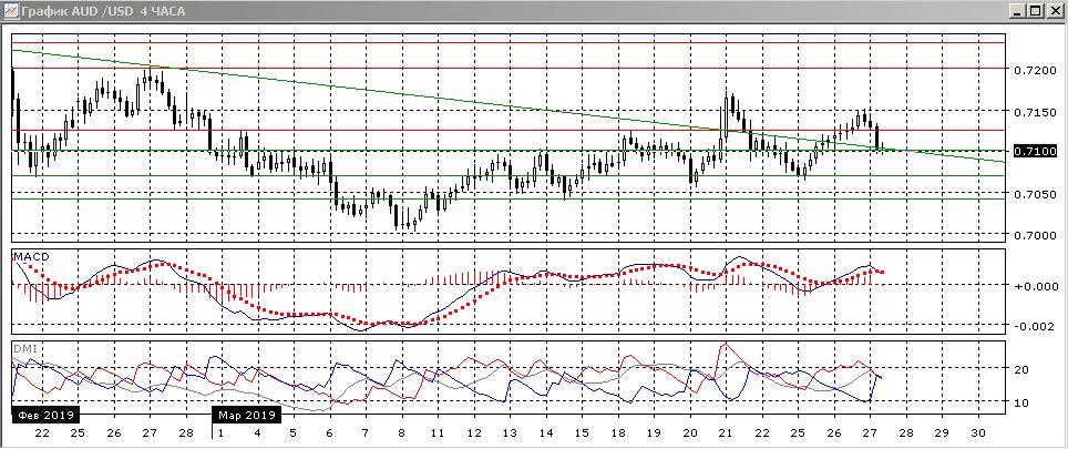 На четырёхчасовом графике откат от 0,7150 получил поддержку на 0,7100, здесь снижение приостановилось, но учитывая, что рост с 25 марта был достаточно медленным и с образованием свечей «дожи», а снижение более энергичным, скорее пара преодолеет уровень 0,7100. В этом плане важно и то, что последняя вершина была ниже предыдущей, а ранее пара последовательно росла с 8 марта. Целью снижения сейчас видится предыдущий минимум на 0,7070.