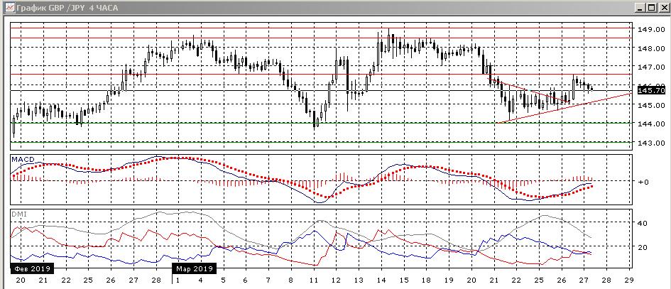 На четырёхчасовом графике пара вышла из треугольника, образовавшегося после снижения 20-21 марта, вверх, противоположно предыдущему движению. Это может быть признаком разворота, хотя рост пока не получает развития и движение вверх от минимума 21 марте не вышло за пределы коррекционного. Краткосрочно более вероятным видится снижение к краткосрочному восходящему тренду, около 145,20. В более долгосрочной перспективе целью видится возвращение к исходной точке коррекции выше 144,00.