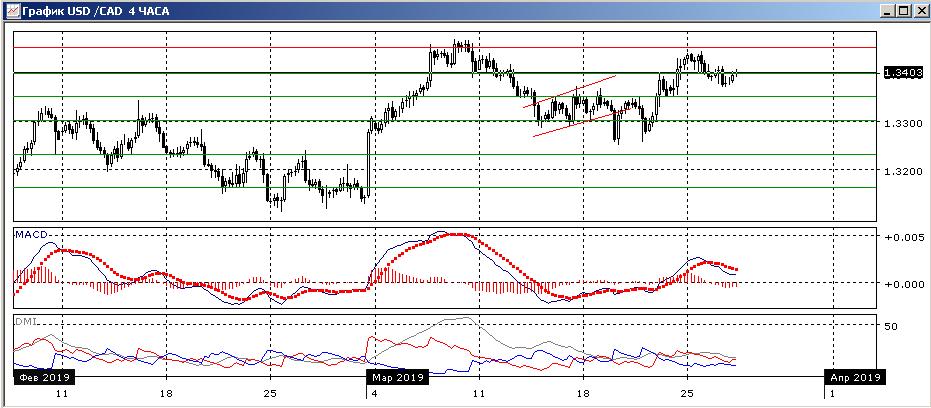 На дневном графике пара снизилась от сопротивления на 1,3450. Это около предыдущего максимума марта, Если смотреть более долгосрочно, последовательный рост пары с начала февраля не нарушен, и пара может тестировать предыдущий максимум февраля. Если это произойдёт, скорее будет медвежье расхождение максимумов пары и гистограммы MACD, что увеличит вероятность отката и сделает менее вероятным дальнейший рост без периода бокового движения. По ADX тенденция роста остаётся слабой, так как уровень ADX достаточно низкий.