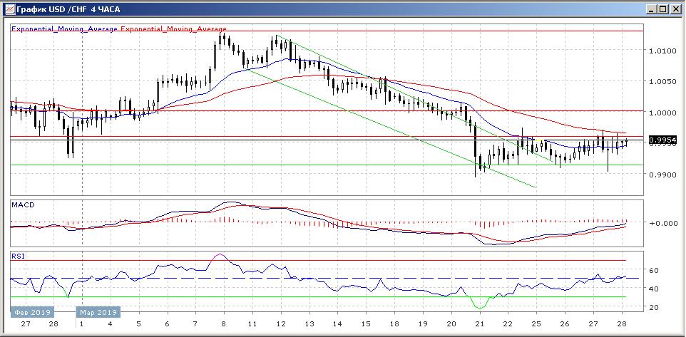 На четырёхчасовом графике мы видим, что пара вышла за рамки нисходящего коридора, что говорит о том, что медвежий тренд выдохся и на данный момент наблюдается перегруппировка сил. В качестве поддержки выступает очень сильная цена по 0.9913 за швейцарский франк и медведям потребуется много усилий для того, чтобы её преодолеть.