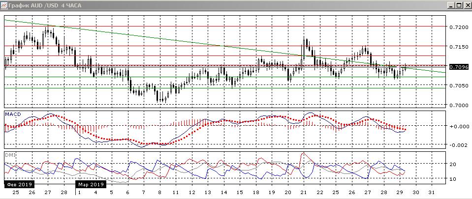 На четырёхчасовом графике с точки зрения движения в более узком диапазона 0,7070-0,7100 предпочтительно снижение, но с точки зрения движения в более широком диапазона — возможно продолжение движения до уровня сопротивления на 0,7150. По индикаторам направленного движения в этом масштабе тоже флэт: ADX на низком уровне, гистограмма MACD колеблется около нуля.