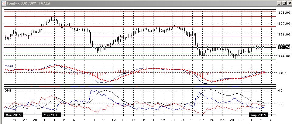 На четырёхчасовом графике рост приостановился у сопротивления на 125,00 (там же максимумы 26 марта). Если предположить движение в диапазоне 123,65-125, то пара скорее будет снижаться к нижней границе. Краткосрочно образуется более узкая консолидация ниже 125,00, и скорее дальнейшее движение будет в сторону выхода из неё — если откат от 125,00 продолжится, то более вероятно — к минимумам 22-28 марта. Преодоление уровня 125,00 изменило бы картину.