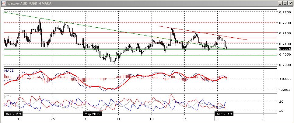 На четырёхчасовом графике видно, что пара снизилась от линии тренда, проведённой через максимумы конца марта. Пара, вероятно, будет тестировать уровень поддержки на 0,7070. В целом, пока пара остаётся выше этой поддержки, она остаётся в диапазоне. По индикаторам направленного движения в этом масштабе флэт: ADX на низком уровне, DM- и DM+ пересекаются, гистограмма MACD колеблется около нуля.