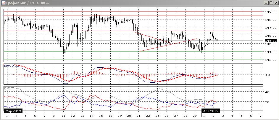 На четырёхчасовом графике пара снизилась после приближения к максимумам 26-27 марта. Если рассматривать стабилизацию, то снижение к нижней границе диапазона на 144,00 сейчас кается более вероятным (после достижения верхней границы). По индикаторам направленного движения в этом масштабе скорее уже флэт: DM- и DM+ близки при снижающемся ADX, гистограмма MAСD колеблется около нуля.