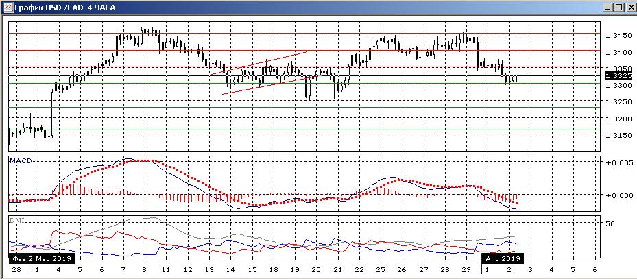 На дневном графике пара снизилась от сопротивления на 1,3450 (также максимум марта). Снижение произошло после приближения к медвежьему расхождению максимумов пары и гистограммы MACD. Откат был достаточно сильным (на вышедших в пятницу лучше ожиданий данных по ВВП). Пара вернулась к сильному уровню поддержки 1,3300 — ранее этот уровень был сопротивлением с середины января до начала марта, потом поддержкой в середине марта. Преодоление этого уровня может привести к дальнейшему снижению, но так как уровень поддержки сильный, вероятность отскока сейчас усиливается. По ADX флэт: DM+ и DM- близки при низком уровне ADX.