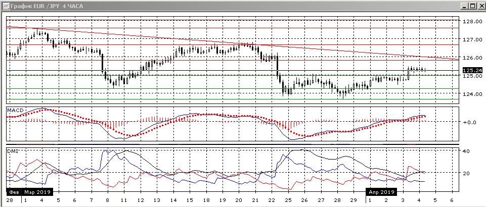 На четырёхчасовом графике пара перешла к росту, и консолидируется выше ранее преодолённого уровня сопротивления 125,00. При этом образовалось медвежье расхождение максимумов пары и гистограммы MACD, что увеличивает вероятность отката. Однако сама консолидация выше верхней границы диапазоне предполагает, что скорее пара выйдет из консолидации вверх и в этом случае ограниченной целью может быть нисходящая краткосрочная линия тренда около 126. Возвращение пары в канал 123,65-125,00 сделало бы предпочтительным снижение к нижней границе канала.
