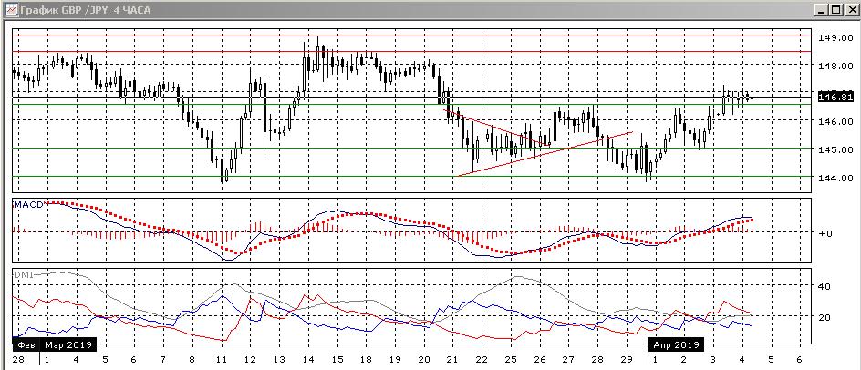 На дневном графике было закрытие ниже предыдущего относительного максимума. Это может обозначать разворот, по крайней мере краткосрочно — ранее максимумы и минимумы пары снижались от 149. Однако, свеча среды имеет относительно большую верхнюю тень, и это не похоже на уверенный прорыв, следовательно, важно, чтобы пара закрепилась выше сопротивления на 146,60. По индикаторам направленного движения ситуация стала близка к нейтральной: DM+ и DM- близки, гистограмма MACD выросла к нулевому уровню, но разворота линии MACD ещё не произошло. Если пара закрепится выше 146,60, то целью будет видеться возвращение к сопротивлению на 149,00. При закрытии ниже этого уровня, скорее пара вернётся с уровню поддержки на 144,00 (около промежуточного уровня двойной вершины конца февраля — середины марта).