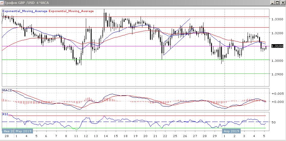 Скользящие средние ЕМА21 и ЕМА55 развернулись вниз и снижаются. Гистограмма MACD опустилась в область ниже своей центральной линии и так же растёт вниз. Индикатор RSI сформировал аналогичный сигнал. Таким образом, нам представляется уместным продавать в краткосрочной перспективе с целью в районе уровня поддержки на 1.3000 и покупать при отскоке с целью на 1.3180.