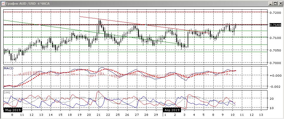 На четырёхчасовом графике видно, что пара получила поддержку у ранее преодолённого уровня 0,7125. Относительные максимумы и минимумы пары в апреле последовательно растут. Пара вернулась близко к предыдущему максимуму у 0,7150 (там же находится относительный максимум конца января). Пока кажется более вероятным, что рост пары продолжится, так как 2-3 апреля, вероятно, произошёл разворот.