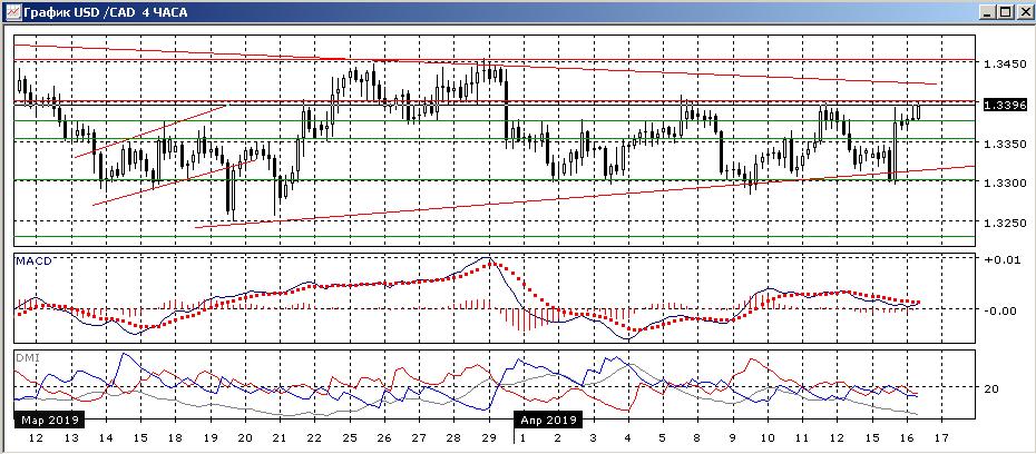 На четырёхчасовом графике пара достигла верхней границы сопротивления 1,3300-1,3400, который сохраняется начала апреля. Отката от 1,3400 не было, и восстановление к сопротивлению на 1,3400 увеличивает возможность выхода пары из диапазона вверх. Также в сторону роста то, что пара не снизилась после образования «падающей звезды» на уровне 1,3375
