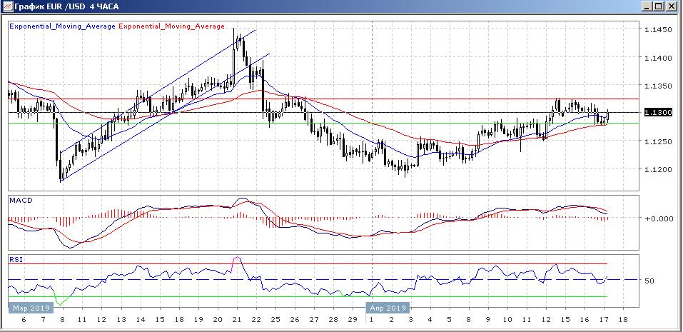 Техническая картина на четырёхчасовом графике выгладит неоднозначно. Согласно MACD наблюдается небольшое укрепление медвежьей тенденции, но согласно RSI накопление потенциала за быками. Скользящие средние с периодом в 21 и 55 дней замедлились и развиваются в боковом тренде. Однако, мы считаем, что этого не достаточно для вхождения в этот рынок и предпочитаем подождать формирования определённых сигналов.