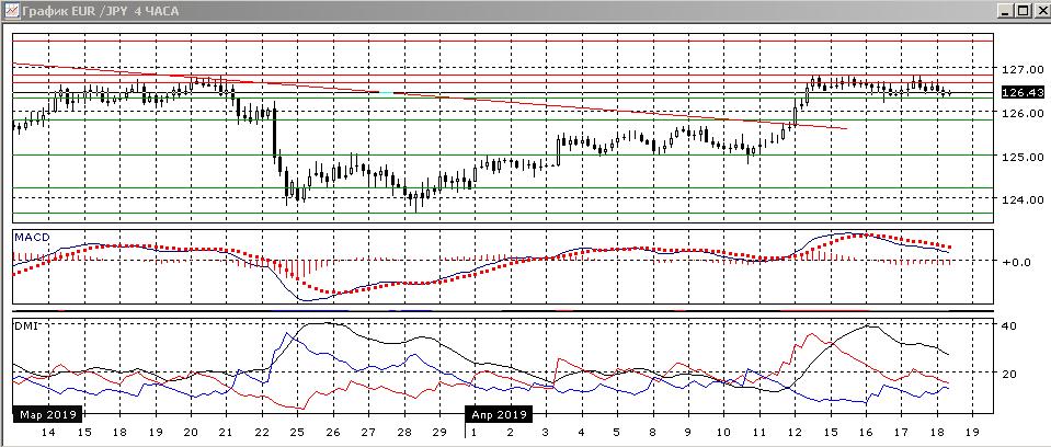На четырёхчасовом графике происходит консолидация в границах 126,30-126,85. Пара снизилась до нижней границы, и в рамках движения в диапазоне предпочтительно движение к верхней границе. Более значительное движение, скорее, будет в сторону выхода пары из диапазона. Более вероятное направление выхода — вверх, так как консолидация происходит после роста. По индикаторам направленного движения в этом масштабе коррекция к снижению: превышение DM+ над DM- сохраняется, но гистограмма MACD снижается уже в в отрицательной зоне, линия MACD имеет отрицательный наклон.