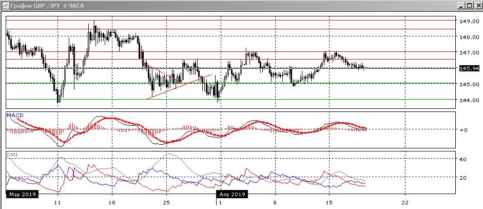 На дневном графике пара снизилась от уровня 147, сопротивления на предыдущем максимуме апреля. Это делает более вероятным снижение пары к предыдущему минимуму на 145. В более широкой перспективе пара остаётся в нижней половине диапазона с конца февраля, если представлять его 144-149. Более отдалённой целью снижения является нижняя граница диапазона, у минимумов марта. По индикатора направленного движения ситуация близка к флэту: превышение DM- над DM+ небольшое при относительно низком уровне ADX, гистограмма MACD около нуля, линия MACD горизонтальна. Это скорее тоже подтверждает движение в диапазоне.