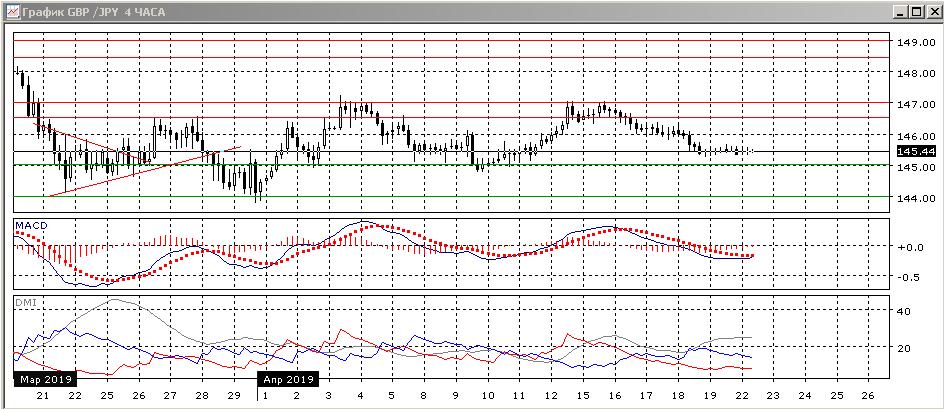 На четырёхчасовом графике пара стабилизировалась выше нижней границы диапазона с начала апреля 145-147. Исходя из движения в диапазоне, вероятность роста от 145,00 повышается с возможной целью на верхней границе диапазона 147,00. Относительные максимумы пары продолжают снижаться, но последовательность снижения минимумов уже нарушена.