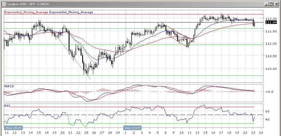 Скользящие средние с периодом в 21 и 55 дней прекратили рост, и развиваются в боковом тренде, а четырёхчасовой график опустился ниже них.