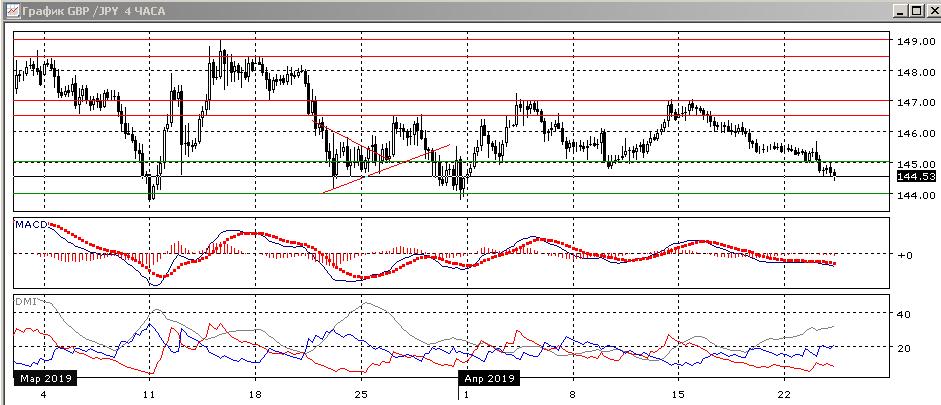 На четырёхчасовом графике последовательное снижение от 147,00 продолжается. Преодоление уровня 145,00 открывает пространство для дальнейшего снижения к следующему уровню поддержки на 144,00. Уровень 145,00 был преодолён несмотря на образование бычьего расхождения минимумов пары и гистограммы MACD, это скорее подтверждает тенденцию, при том что расхождение сохраняется. По ADX тенденция снижения относительно сильная — ADX на высоком уровне, превышение DM- над DM+ значительное и устойчивое.