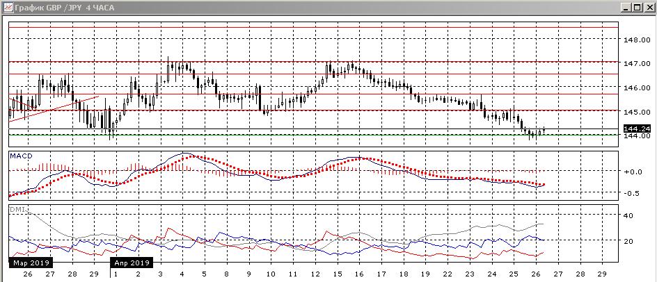 На четырёхчасовом графике последовательное снижение от 147,00 продолжается, и от 144,00 происходит очередная коррекция вверх. Тенденция пока не меняется. По индикаторам направленного движения тенденцией является снижение: DM- устойчиво выше DM+, ADX на относительно высоком уровне, гистограмма MACD остаётся в отрицательной зоне, линия MACD сохраняет отрицательный наклон.