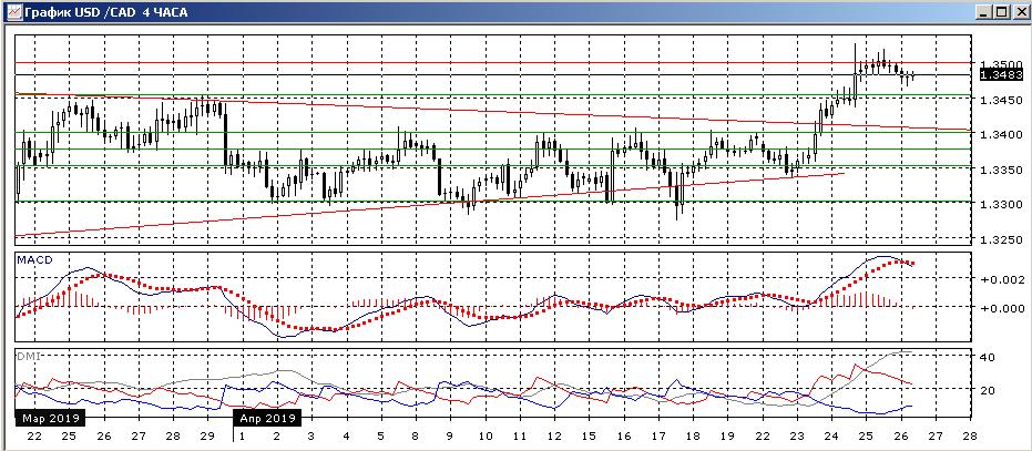 На четырёхчасовом графике происходит коррекция к росту пары после тестирования уровня 1,3500. Однако коррекция, кажется не ускоряется и возможно приостанавливается, поэтому уровень 1,3450 скорее устоит как поддержка. По индикаторам направленного движения также коррекция к росту: повышение DM+ над DM- большое и устойчивое при высоком уровне ADX, коррекция видна по снижению гистограммы MACD и развороту линии MACD.