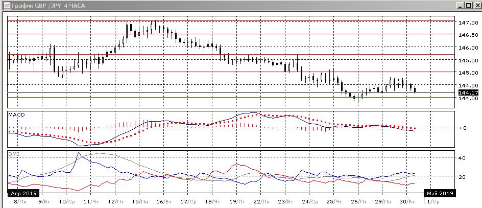 На четырёхчасовом графике отскок от уровня поддержки на 144,00 не привел к пару ближайшему уровню сопротивления 145,00 — снижение кажется началось раньше. Если предполагать, что коррекция вверх завершается, то целью видится уровень 144,00.