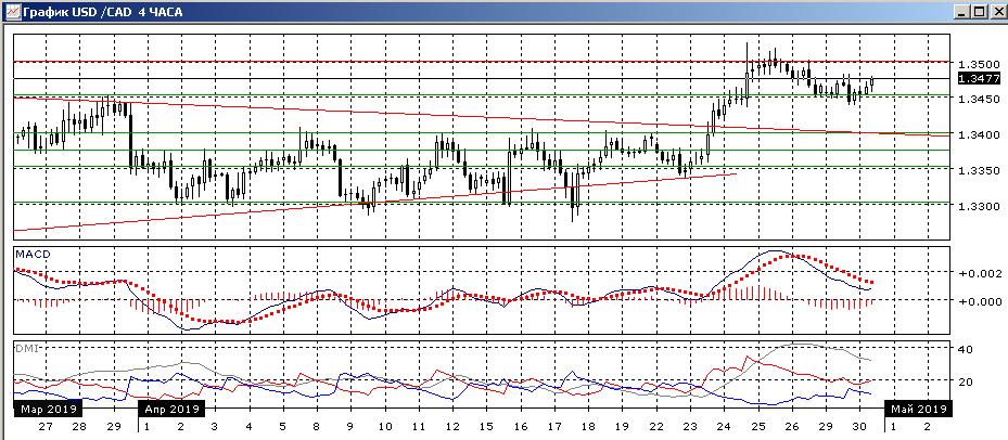 На четырёхчасовом графике у 1,3450 образовалось два минимума, у последнего был ложный пробой поддеркжи на 1,3450. Скорее это говорит о том, что пара будет возвращаться к 1,3500. По индикаторам направленного движения сохраняется коррекция к росту: повышение DM+ над DM- большое и устойчивое при высоком уровне ADX, откат привел к снижению гистограммы MACD в отрицательную зону (но теперь гистограмма растёт) и отрицательному наклону линии MACD. Однако на максимумах конца апреля, если пара их достигнет, образовалось бы медвежье расхождение максимумов пары и гистограммы MACD. Это может привести к новому откату.
