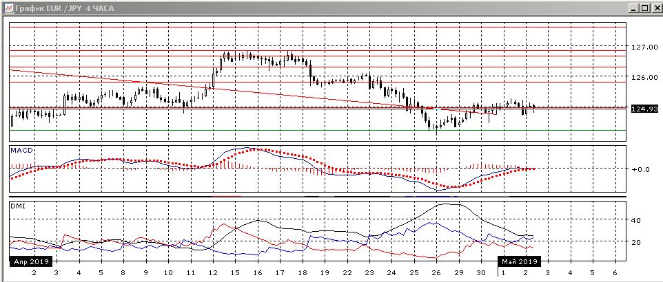 На четырёхчасовом графике пара стабилизировалась около 125,00, отчасти ситуация нейтральная — после образования медвежьего расхождения максимумов пары и гистограммы MACD, и возможного подтверждения его преодолением уровня 125,00. В более длительной перспективе скорее колебания около 125,00 завершатся возвращением к исходному уровню коррекции 124,00.