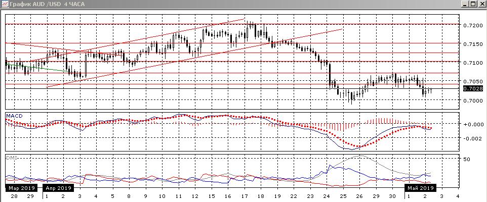 На дневном графике отскок от 0,7000 вверх кажется завершается, и пара будет вновь тестировать уровень 0,7000. Так как пара осталась у нижней границы долгосрочного канала 0,70-0,72 без движения к верхней границе, выход из канала вниз кажется предпочтительным, но но рассчитывать на это до закрытия ниже 0,7000 преждевременно. По индикаторам направленного движения тенденция снижения сохраняется: превышение DM- над DM+ большое, ADX растёт, гистограмма MACD остаётся в отрицательной зоне, линия MACD сохраняет отрицательный наклон.