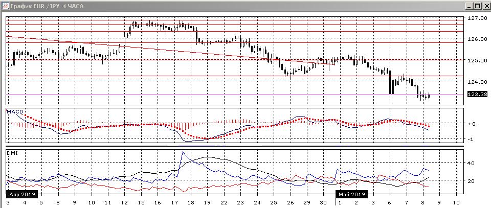 На четырёхчасовом графике преодоление зоны 124-124,25 подтверждается тем, что она выступила для пары сопротивлением. Пара достигла более низкого, чем 6 мая, минимума (теперь он выступает сопротивлением при приостановке снижения). Пока кажется, что продолжение снижения предпочтительно. По индикаторам направленного движения тенденция снижения усиливается: превышение DM+ над DM- увеличивается, уровень ADX вырос, гистограмма MACD снижается в отрицательной зоне, линия MACD имеет отрицательный наклон.