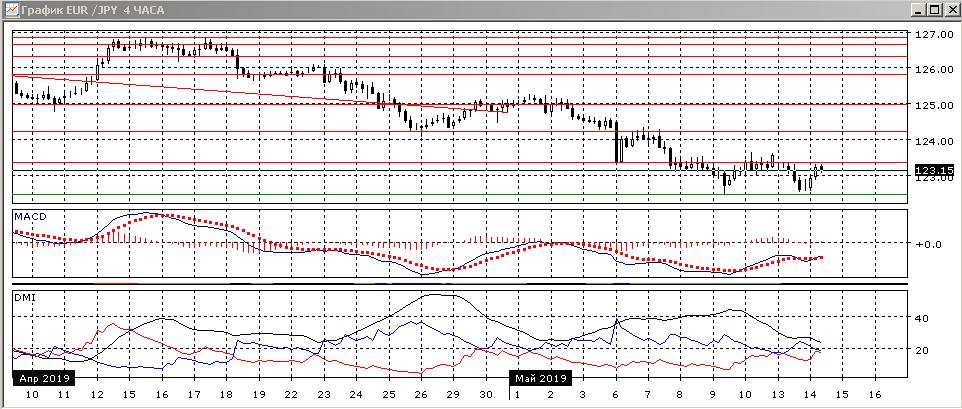 На четырёхчасовом графике может образоваться ситуация разворота: двойное дно у 122,50, с сопротивлением промежуточного максимума на 123,40. По индикаторам направленного движения тенденции уже нет: DM+ и DM- близки, гистограмма MACD около нуля. Закрепление выше 123,40 может означать преодоление промежуточного максимума двойного дна и тем самым подтверждение модели. Исходя из её размера, первичной целью в этом случае может быть 125,00.