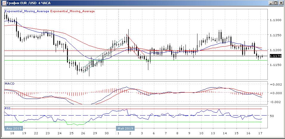 Четырёхчасовой график располагается ниже скользящих средних с периодом 21 и 55 дней, что говорит о явной нисходящей тенденции. Наш прошлый прогноз полностью реализовался. Скользящие средние продолжают своё снижение, подав сигнал на продажу с пересечением вниз линии 21 линию 55.