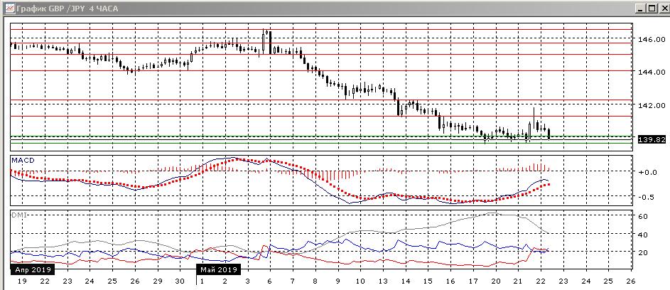 На четырёхчасовом графике последовательность снижения относительных максимумов и минимумов пары была нарушена, однако уровень 141,25 (около минимума 13 мая) ограничил отскок, и после этого пара почти вернулась к начальной точке коррекции у 139,65. Около этого уровня образовалось уже три относительных минимума, и здесь может образоваться база, если уровень не будет преодолён в ближайшее время. По индикаторам направленного движения тенденции снижения уже нет: DM+ и DM- близки, по более краткосрочным индикаторам рост (гистограмма MACD в положительной зоне, линия MACD имеет положительный наклон).