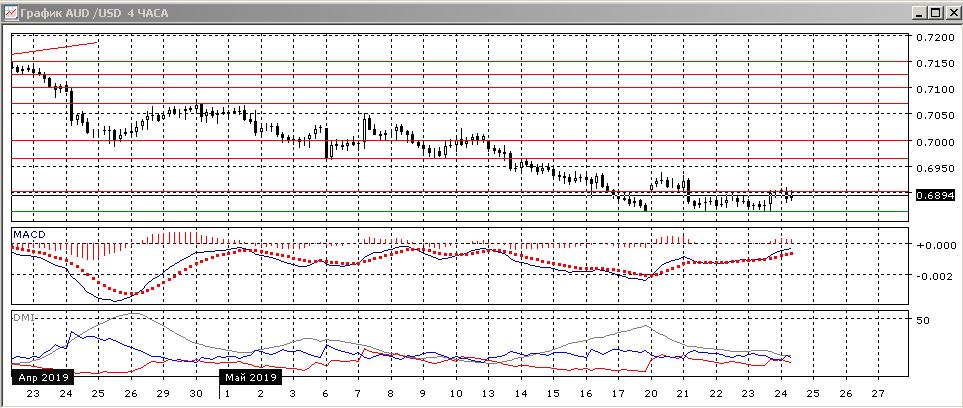 На дневном графике пара база на 0,6865 укрепляется, и движение в краткосрочной перспективе скорее будет в сторону выхода из узкого диапазона 0,6865-0,6900, в котором пара находится с 21 мая. В рамках движения в этом диапазоне предпочтительно снижение, но отсутствие возвращения к нижней границе увеличивает вероятность выхода из диапазона вверх. При выходе следующее сопротивление можно ожидать на максимумах 20-21 мая у 0,6940.