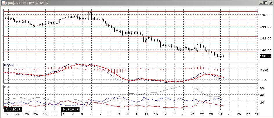 На четырёхчасовом графике снижение продолжилось после преодоления уровня 139,65 (где ранее образовалось три минимума). По индикаторам направленного движения снижение вновь стало тенденцией: DM- выше DM+, гистограмма MACD остаётся в отрицательной зоне, линия MACD имеет отрицательный наклон. Снижение замедляется (это видно по уменьшению наклона графика), но разворота не было, и при отскоках скорее оно будет возобновляться.
