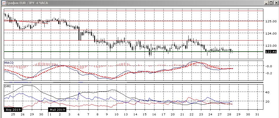 На дневном графике пара остаётся у уровня поддержки 122,50. Она остаётся у минимума мая, после образования свечей дожи за дни низкой активности пара может продолжить снижение, так как коррекция к предыдущему снижению завершилась. Однако это привело бы к образованию бычьего расхождения минимумов пары и гистограммы MACD. Дальнейшее движение скорее будет в сторону выхода из диапазона 122,50-123,40.