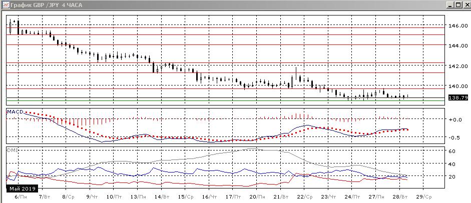 На четырёхчасовом графике пара стабилизировалась в диапазоне 138,45-139,65. Пока текущая консолидация похожа на предыдущую (15-22 мая). В рамках движения в диапазоне целью видится движение к верхней границе — на 139,65, так как пара уже приблизилась к нижней. По индикаторам направленного движения уже флэт: DM+ и DM- близки, гистограмма MACD около нуля.