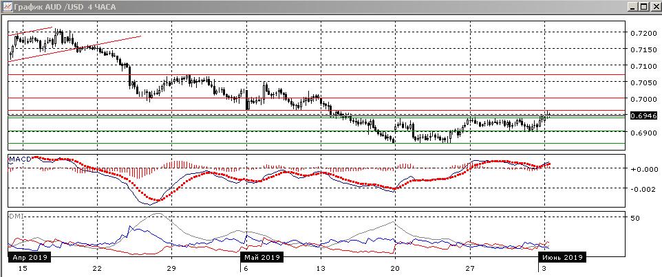 На четырёхчасовом графике выход пары из диапазона 0,6900-0,6940 вверх предполагает цель на 0,6980 (движение, равное размеру диапазона). Это примерно соответствует следующему «круглому» уровню 0,7000, который сейчас можно рассматривать как сильное сопротивление и с технической, и с психологической точки зрения. Верхняя граница диапазона конца мая 0,6940 уже выступает уровнем поддержки для пары. По индикаторам направленного движения флэт пока сохраняется (превышение DM+ над DM- небольшое, ADX на низком уровне).