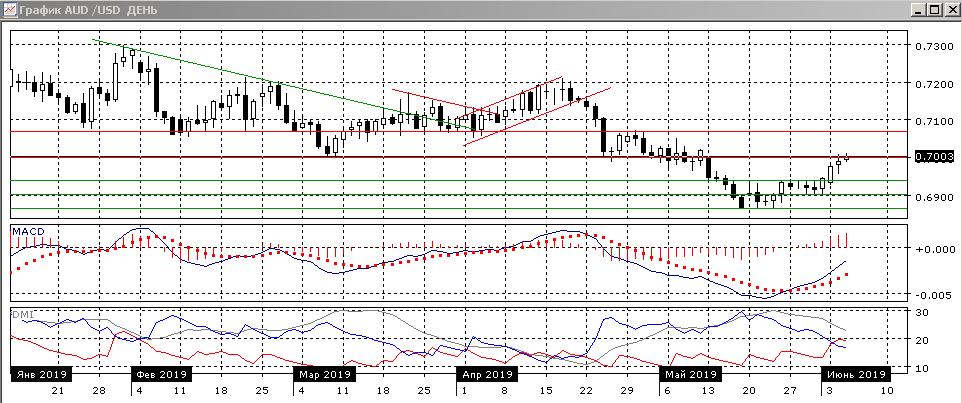 На дневном графике пара достигла следующего сильного уровня сопротивления на 0,7000. Так как пара чаще двигается между «круглыми» уровнями, это увеличивает вероятность отката. Дальнейшая перспектива скорее будет определяться устойчивостью уровня 0,7000 — при его преодолении следующей целью видится следующий сильный уровень сопротивления на 0,7070. Относительные максимумы и минимумы пары сейчас последовательно растут. По индикаторам направленного движения пара перешла к росту: DM+ теперь выше DM-, гистограмма MACD растёт в положительной зоне, линия MACD имеет положительный наклон. Рост пары при выходе не вдохновляющих данных по ВВП в первом квартале показывает, что рост остаётся направлением наименьшего сопротивления на данный момент.
