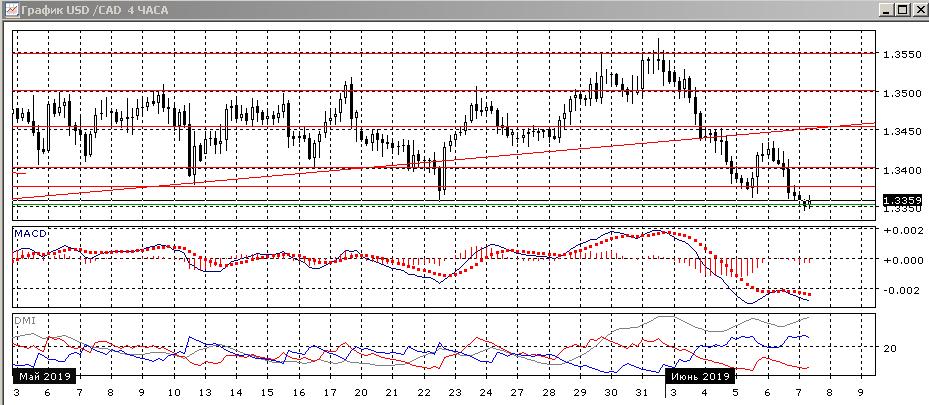 На четырёхчасовом графике пара достигла нового минимума у уровня поддержки на 1,3350, но здесь же образовалось бычье расхождение минимумов пары и гистограммы MACD, что увеличивает вероятность отскока вверх. По ADX тенденция в этом масштабе остаётся сильной: превышение DM- над DM+ большое и устойчивое при высоком уровне ADX. При отскоке сильное сопротивление будет близко — на предыдущей нижней границе диапазона 1,3375.